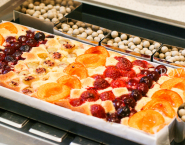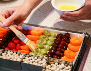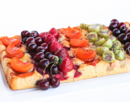 The baking tray lined with baking paper. Pour into the prepared tin frangipanebeslag and decorate as desired with fruits. Spread the fruit with melted butter so it will not dry or burn in the oven.