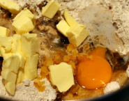 The original recipe calls for candied lemon peel. I had no lemon peel, so I used orange peel. Chopp the peel finely. Mix all ingredients together in a bowl and whisk with a kneading path extensions. Put prepared dough on a floured work surface and stir again to a smooth batter.