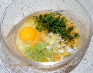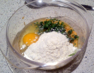 Mix all ingredients together in a bowl. The dough may not run or be too thick. Add salt en pepper and mix again.