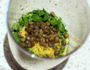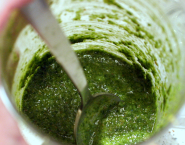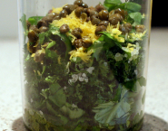 Puree chopped mint, parsley and basil with a little coarse-grain salt, capers, olive oil, lime juice and grated rind of the lemon in the upper container. Ready.