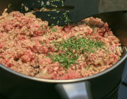 First prepared the meat: Saute the onion until translucent in olive oil, add minced beef, thyme and rosemary and cook until grainy. Season with salt and pepper and add a little meat broth. Allow to simmer and ready.