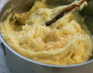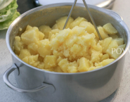 Then boil the potatoes in salted water. Strain, add the butter and milk and mix together. Season with nutmeg, salt and pepper and keep warm side.