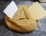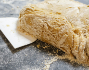 - The dough is now made for 90% but not yet completely finished – you can still see the unprocessed flour. This is the moment when I bring it to the workplace.