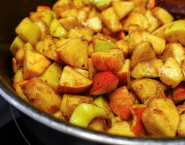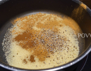 Heat the knob of butter in the pan and caramelise the sugars, maple syrup and the spices together. Than add the apples and bake them for about 10 minutes till golden. When the apple mixture nicely browned, pour it into a sieve to remove the excess butter and the juice released.