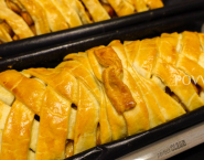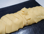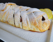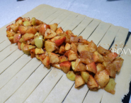 Meanwhile roll out the pastry and open gash left and right even strokes in the dough. Spread the apple-mixture out in the middle of the dough. Crisscross the strips then all over the mixture.