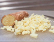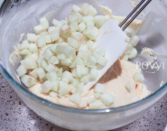 Grease a cake tin (approximately 30 cm long with a volume of 2750 ml) and dust it with flour. Peel the ginger (50 g) and cut into fine. Peel the apples, cut the flesh into small cubes and sprinkle with lemon juice.