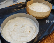 In a large bowl, beat the egg whites until stiff. Beat the sugar erdoor- little by little. Now spatula toasted and chopped hazelnuts through. Divide the mixture between the two prepared forms and spread it as evenly as possible.