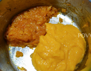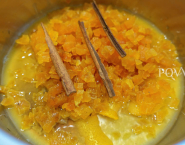 While the meringues in the oven, prepare the filling. Place all ingredients (save half the orange juice) in a shallow pan, bring to a simmer and let simmer for 30 minutes throughout without cover. Remove the pan from the heat and already everything has cooled, remove the cinnamon stick and orange peel. Process the half of the mixture with the orange juice withheld until a puree with a hand blender. Mix the puree with the rest of the filling.