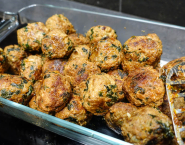 Chop the spinach a bit and put it in the bowl. Add the meat, eggs mustard, ketchup and breadcrumbs and season everything with salt and pepper. Mix everything well together.