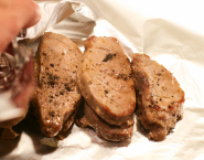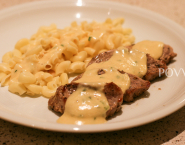 Cut the tenderloins into slices of 1,5 cm. Season the meat with salt and pepper and bake brown in a little butter. Remove the tenderloins from the pan and let rest for 5 minutes covered with foil.