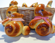 Let the bunnies now rise for 30 minutes under a clean tea towel. Brush after rising with beaten egg and bake 10 minutes in preheated oven.