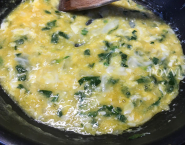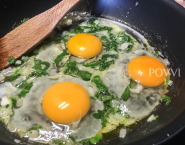 Heat the butter and fry the onion until it is glassy. Add the mint and cook together for a minute. Then add the eggs and salt and stir to get the non-dry scrambled eggs.