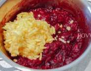 Wash and peel the apples and remove the core. Grate the apples and mix with cinnamon and vanilla sugar. Mix them afterwards under the cranberry compote.