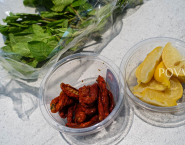 Chop the dried tomatoes into small pieces and place in a mixing bowl or mixer. Add the chopped mint at, sliced garlic and finely chopped candied lemon wedges. Finally, add the olive oil and blend until smooth and no ongoing sauce.