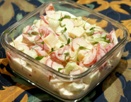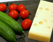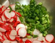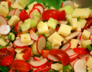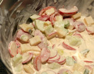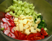 Mix all the vegetables together with the cheese in the bowl. Add the sour cream and season with would. Mix again thoroughly and serve with piece of dark bread or baguette.