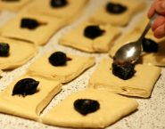 After proving roll the dough to a thickness of about 5 mm and cut into squares about 3,5 inch. Fill them with jam, fruit or chocolate, enclose a form into buns.