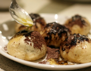 Boil water in a saucepan and put the steamer inside. Grease it with oil, so the buns will not stick while steaming. Put about 6 buns into a pan, cover them and steam on a moderate heat for 8 minutes. In meanwhile, melt butter in a frying pan and in a small bowl mix together cocoa and caster sugar for sprinkling.