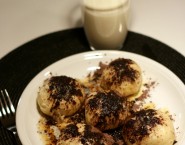 When buns are ready serve them on heated plate, sprinkle with a mixture of cocoa and sugar and pour over with little melted butter.
