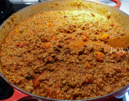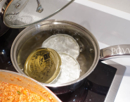 Prepare the Bolognese as described in the recipe in the link. Sterilise the jars and the tops in the boiling water. Put the bolognese in the jars and let the last level be the sauce (see photo). Close the jars and sterilise the Bolognese for 90 minutes in the pot with boiling water (at 100°C). Allow the jars to cool after sterilisation.
