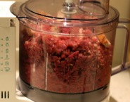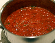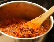 The meat must be after baking very grainy and contain no lumps. If it is almost done, add finely chopped basil there and cook another minute. Put them on the fire, mix together the tomato sauce and let cool. Now you can also freeze the sauce.
