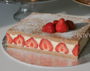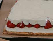 Apply a thinner layer of cream on the first part of biscuits. Top with washed and drained strawberries. Fill the pastry bag with the cream and apply it in the same layer between the strawberries. Spread the remaining cream on top of the strawberries and all around the cake. Then top with the second part of biscuits and set for at least an hour to solidify.