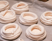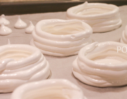Place a square of baking parchment on a large baking sheet. Pencil nine circles, about 7cm each, onto the parchment. Spoon the meringue into a large piping bag fitted with a plain nozzle and pipe concentric rounds to fit each drawn circle, piping two or more rings around the edge to form a nest. Bake for 2 hrs until they are crisp and lift off the paper easily. Leave to cool completely.
