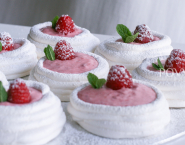 To assemble, cut the remaining strawberries into 9 slices and place a slice inside each meringue case. Generously share the rippled cream between the cases, then top with a raspberry and a mint sprig. Dust with a little icing sugar just before serving. ( Meringues keep in an airtight container for 2 days.)
