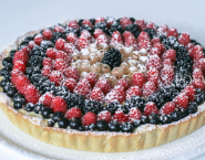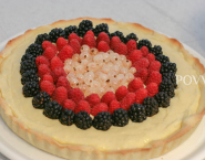 Once the pie cooked and cooled, pour the custard over and decorate with raspberries and white currants.