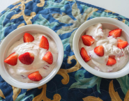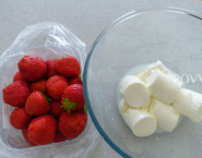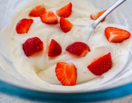 Mix the cream with the sugar and vanilla powder thoroughly. Wash and cut the fresh strawberries or other fruits into small pieces and mix them under the cream. Ready!