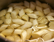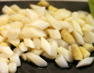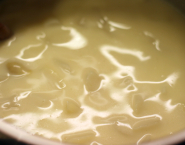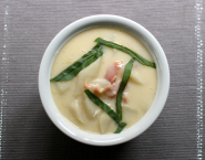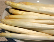 Snijd de asperges in stukjes en houd de kopjes apart. Kook de asperges in ca 8 dl water met het bouillonblokje beetgaar. Laat de laatste 4 minuten de kopjes meegaren. Zeef de asperges uit het kookvocht. Smelt de boter en voeg al roerend de bloem toe en vervolgens geleidelijk het asperge kookvocht. Roer tot je een gladde massa hebt. Doe de asperges in de soep en laat alles ca. 10 minuten zachtjes koken.
