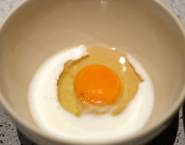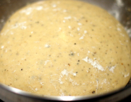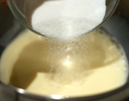 Verwarm de melk tot lauw. Klop het ei met een beetje lauwe melk. Giet het mengsel terug in de pan en klop goed. Voeg de suiker, het zout en de kardemom toe en meng goed.