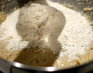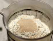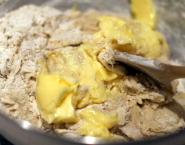 Meng de gist met de bloem. Doe een beetje bloemmengsel in de pan en klop goed, zodat er veel lucht in het deeg komt. Klop er om te beginnen het bloemmengsel met een garde door. Roer wanneer het mengsel te stijf is verder met een houten lepel. Voeg tot slot de boter toe en kneed die met je handen door het deeg tot alles goed gemengd is.