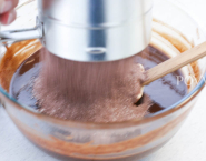 Mix de eieren één voor één goed door de chocolade massa. Zeef de bloem en de cacao boven het mengsel en gebruik een spatel om het er voorzichtig in “te vouwen”. Zorg ervoor dat alle droge ingrediënten goed zijn opgenomen in het chocolade mengsel.