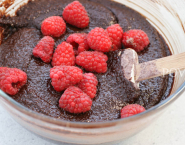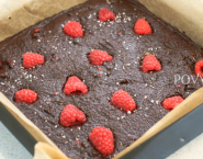 Meng nu de helft van de frambozen in het mengsel en verdeel het geheel over de bakplaat. Voeg nu de andere helft van de frambozen toe en verdeel ze over de bovenkant. Besprenkel alles met grof zeezout en bak in het midden van de oven in 60 a 70 minuten gaar of totdat een satéprikker er bijna helemaal schoon uitkomt als je die in het midden steekt.