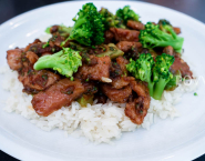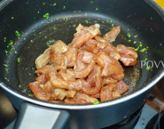 Verlaag de hitte tot medium hoog en voeg de rest van de olie zorgvuldig door. Voeg het gemarineerde vlees plus een helft van het sausmengsel toe en bak ongeveer 3-4 minuten, roer vaak tot het vlees teder is maar niet langer roze is. Roer nu de broccoli in en soteer ongeveer 1 minuut.