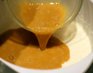 Roer de warme chocolade door het achtergehouden roomkaasmengsel in de kan. Giet dit van de ene kant van de vorm tot de andere in een breed zigzag-patroon op de witte vulling. Haal de steel van een houten lepel ook in zigzag-patroon door de vulling maar nu in tegenstelde richting zodat er een gemarmeerd effect ontstaat. Doe dit niet lang zodat de massa niet rommelig zal zijn. Houdt het simpel en maak een strakke rand.