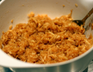Meng geraspte appels met vanille en kristalsuiker, kaneel (optioneel ook met rozijnen). Laat even staan en voor het vullen druk even de sappen weg, zodat de koek niet zal lopen.