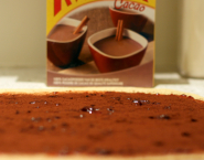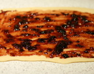 Bestrijk het uitgerold deeg met dunne laag van confituur (best met aalbesconfituur) en bestrooi hem daarna rijkelijk met cacao. De confituur zal voor de zachte structuur en een beetje pikante smaak van de vulling zorgen.