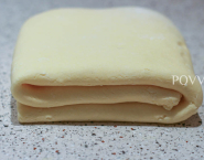Roll the dough into a square of 8 mm thick. To roll will creates breaks at the corners of the dough but with every next step it will get easier, so don’t worry. Coat the remaining butter equal to 2/3 of the rectangle. Fold the dough towards the center closed, starting with the part without butter. It is now ready to be toured. Sprinkle the work surface with a little flour. Roll the dough into a rectangle 1 cm thick. Make sure there is no flour remains on the dough. Fold the dough into thirds – this is the first tour in three.