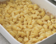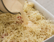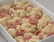 Vet de braadpan en bestrooi met brood kruimels. Maar goed invetten is ook voldoende. Doe de aardappelblokjes erop, vervolgens de de bloemkoolroosjes en in reepjes gesneden ham. Bestrooi het met geraspte kaas en giet over met de melk-roommengsel.