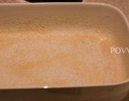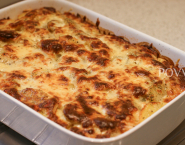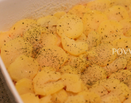 Doe in een hogere container het ei, zuurroom, mosterd, peper en zout en meng alles door elkaar. Schenk het mengsel gelijkmatig over gelaagde aardappelen. Bestrooi ze met de geraspte gruyère of andere lichte kaas en plaats in een voorverwarmde oven op 200°C (hete luchtovens -20°C). Bak ze gedurende 35 minuten.