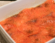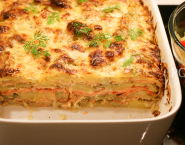 Snijd de gekookte aardappelen in wieltjes zoals eieren leg de eerste laagje van op de bodem van de ovenschaal. Bestrooi ze met zout, peper en dille en voeg nog een laag. Nu verdeel boven de aardappelen gelijkmatig de plakjes zalm. Nu de laag van aardappelen en breng deze ook op smaak met zout, peper en dille. Verdeel nu gelijkmatig de tweede laagje zalm. Nu weer een laagje aardappelen en breng ze terug op smaak met zout en peper en strooi de fijngesneden ui. Verdeel nu over de aardappelen de derde laagje zalm en doe op de top de laatste laagje met de resterende aardappelen. Breng ze nog op smaak met zout, peper en dille.