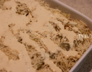 Schil de gekookte aardappelen, schil en hak de ui. De bodem van de ovenschaal invetten met de olie en bestrooi hem met paneermeel.