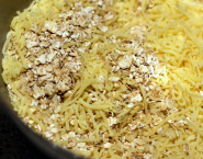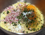 Vermeng in een schaal 2/3 van de versnipperde sjalot, de havervlokken, de geraspte kaas, eieren en de helft van de bouillon. Voeg tijm, zout en peper toe naar smaak en laat het mengsel 1 uur staan. Vorm nadien de koekjes van. Vog eventueel nog wat bouillon toe als het mengsel te droog is.