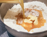 Doe de bloem, gist en suiker in de kom van uw mixer, en gebruik een handheld garde om goed te combineren. Voeg het zout, en klop te combineren. Voeg de boter, ei, ananassap, en vanille, en mix op lage snelheid met de deeghaak tot gecombineerd. Ik heb het in de kom en nadien op het werkvlak gedaan. Verhoog de mixer snelheid aan middelgrote en kneed ongeveer 5 minuten. Het deeg zal heel plakkerig zijn, maar moet glad en elastisch zijn. Breng het deeg een licht ingevette kom, groot genoeg voor het deeg rijzen tot zijn grootte te verdubbelen, en dek af met een geoliede stuk plasticfolie (of de geoliede bovenkant om uw proofing emmer). Plaats het deeg in de ijskast minstens 12 uur en maximaal 5 dagen.