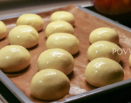Vet een bakblik in en leg het opzij. Haal het deeg uit de koelkast en leg het dan op een licht met bloem bestoven oppervlak. Kneed tot gladder. Met een met bloem bestoven bank schraper, verdeel het deeg in twaalf stukken van gelijke grootte en vorm van ronde broodjes. Plaats de eerste worp in de voorbereide bakvorm. Herhaal het met de resterende deegstukken en plaats ze in de bakblik minder dan 2,5cm van elkaar. Bedek de bakvorm met geolied plasticfolie en leg deze weg op een warme, tochtvrije plaats rijzen 30 minuten. Ontdek de pan en bestrijk de broodjes royaal met het eistrijksel. Laat de broodjes narijzen zonder ze opnieuw met folie af te dekken, tot ze volledig in omvang verdubbeld zijn (ongeveer 20 minuten meer).