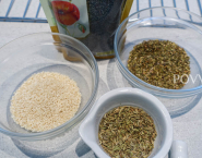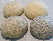 Tip het deeg uit en weer kneed gedurende 2 minuten, dan verdeel het deeg in de helft. Werken met de eerste helft, kneed het sesamzaad in het deeg totdat alle zaden worden opgenomen en gelijkmatig verdeeld.