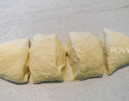 Rol de ene helft in een worst en snijd deze in 4 stukken. Rol elk stuk in een worst en verdeel in 4 stukken. Herhaal hetzelfde met de tweede helft van het deeg.