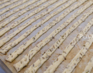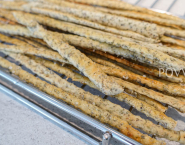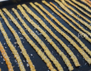 Breng deze naar Vet bakplaten, dek af met plasticfolie en laat de grissini weer te stijgen gedurende 30 minuten. Ontdek de grissini en bestrijk ze met eigeel mengsel en bestrooi licht met zout vlokken. Bak ze 6-8 minuten, tot ze goudbruin en krokant.