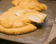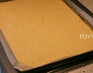 Plech na pečenie vylož papierom na pečenie a ten jemne potri roztopeným maslom. Pripravené cesto vylej do formy, rovnomerne uhlaď a peč približne 12 minút (záleží od hrúbky cesta = veľkosti formy). Po upečení cesto okamžite stiahni z plechu na pracovnú dosku, alebo utierku a ešte za horúca z neho stiahni papier na pečenie.